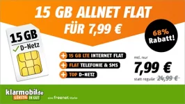 Bei Freenet erhaltet ihr die 15 GB Klarmobil Vodafone Allnet Flat aktuell für nur 7,99€ / Monat im Angebot!