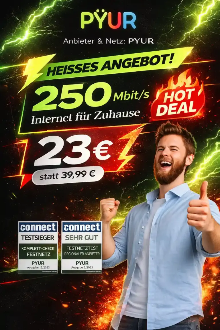 PŸUR Internet-Tarife: Dauerhaft günstig im eigenen Kabelnetz PŸUR gehört zu den wenigen Kabelanbietern mit eigenem Netz in Deutschland. Aktuell locken die Pure Speed Tarife mit dauerhaft günstigen Preisen – auch nach der Mindestvertragslaufzeit. Wir zeigen dir alle Angebote im Vergleich. Alle Pure Speed Tarife auf einen Blick Preis ab 19 €/Monat Speed bis zu 1.000 Mbit/s Netz Eigenes Kabelnetz Besonderheit Dauerhaft günstig Die PŸUR...
