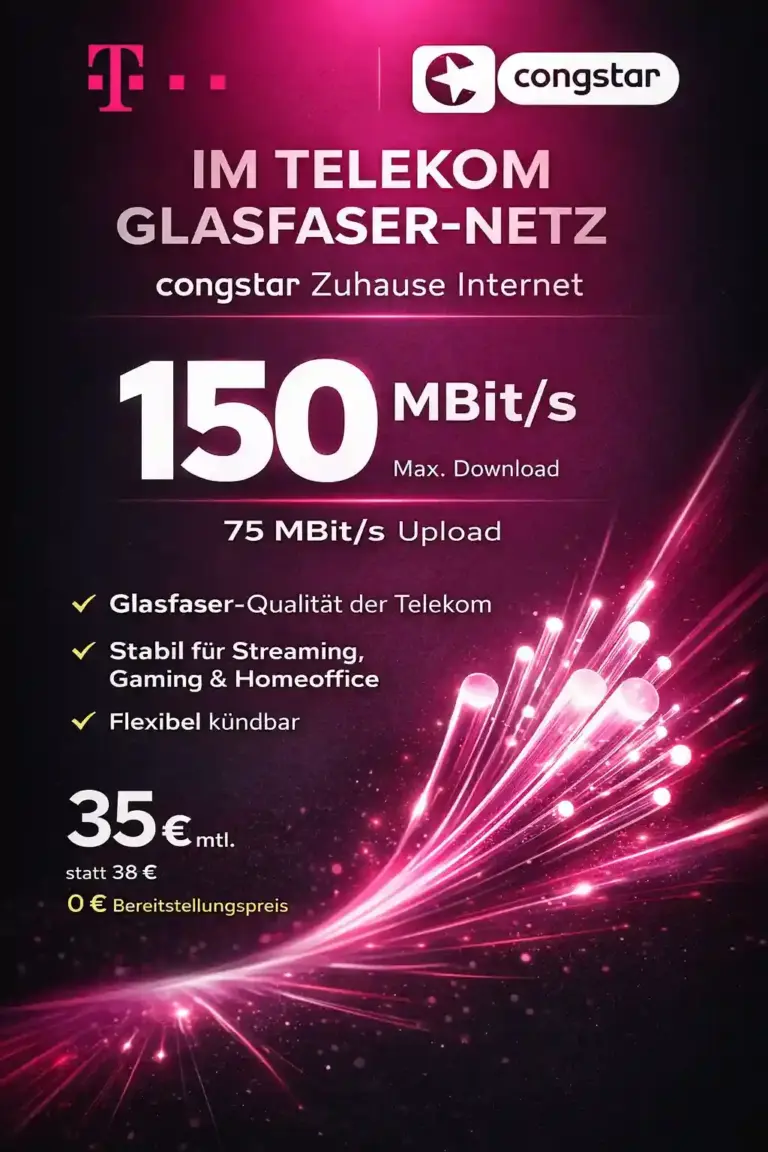 congstar Glasfaser-Tarife 2026 Günstigster Tarif 35 €/Monat Max. Geschwindigkeit 1.000 Mbit/s Anschlussgebühr 0 € Vertragslaufzeit Flex oder 24 Mon. congstar bietet jetzt auch Glasfaser-Tarife an – und das zu attraktiven Aktionspreisen. Alle Tarife gibt es als monatlich kündbare Flex-Variante ohne Anschlussgebühr – oder neuerdings auch mit 24 Monaten Laufzeit zum gleichen Preis. Du surfst mit echtem Glasfaser bis zu 1.000 Mbit/s. Wir zeigen dir alle...