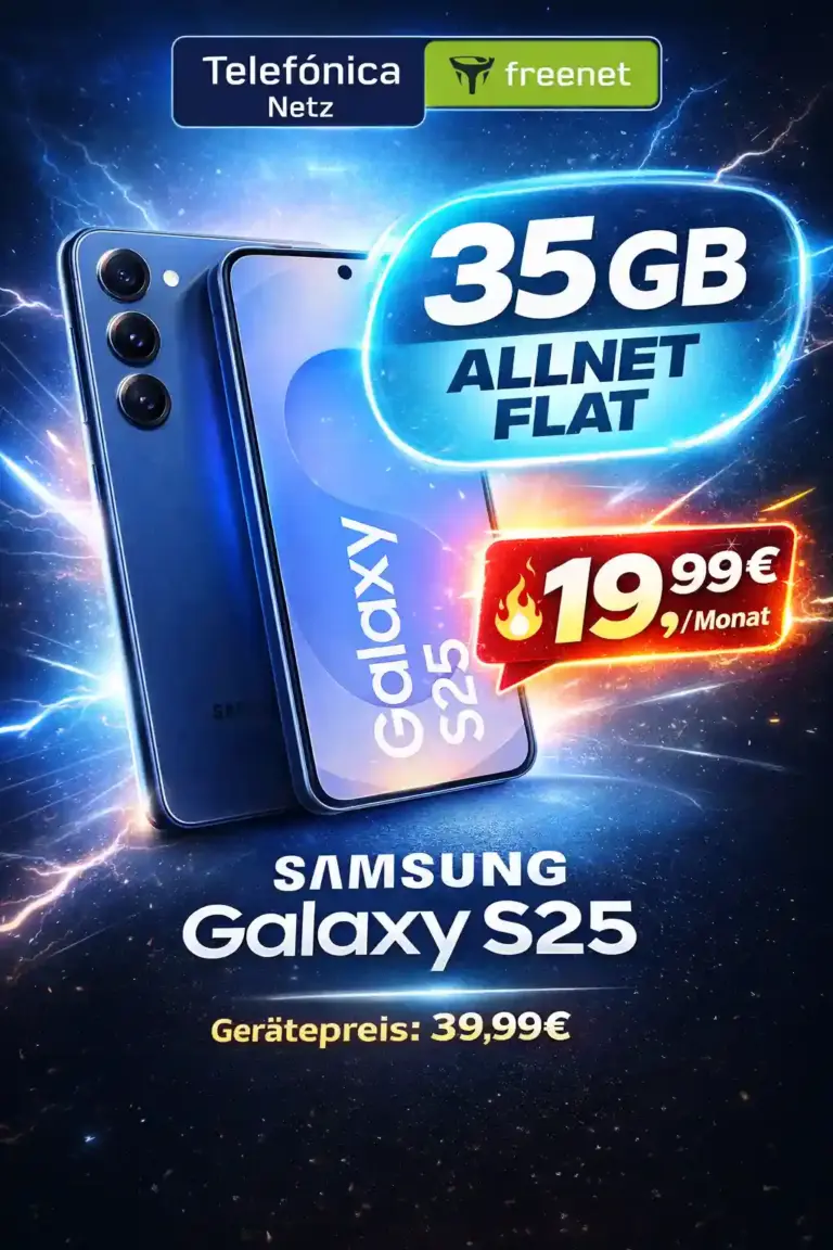 📱 Samsung Galaxy S25 + freenet 35 GB – Auf einen Blick Effektivpreis -1,64 €/Mo. Datenvolumen 35 GB 5G Grundgebühr 19,99 €/Mo. Netz o2 (Telefónica) Das Samsung Galaxy S25 bekommst du bei MediaMarkt zusammen mit dem freenet Allnet Flat 35 GB für nur 39,99 € Zuzahlung. Bei einer Grundgebühr von 19,99 € im Monat ergibt sich ein negativer Effektivpreis von -1,64 €. Du zahlst also...