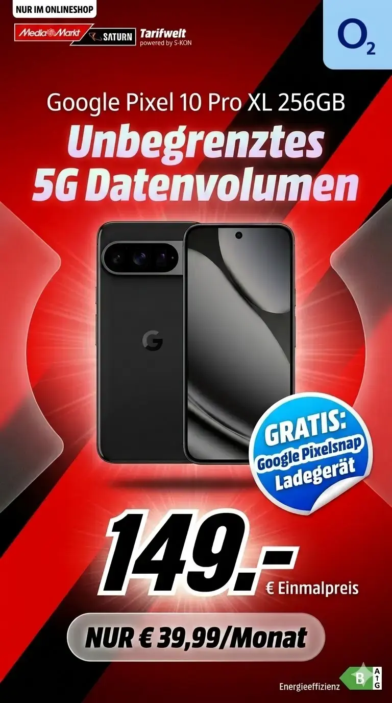 Das Google Pixel 10 Pro XL 256 GB gibt es bei MediaMarkt mit dem o2 Mobile Unlimited on Demand für 39,99 €/Monat. Du surfst mit bis zu 300 Mbit/s im o2-Netz — quasi ohne Datenlimit. Bei einem Gerätewert von 859 € (Geizhals) ergibt sich ein Effektivpreis von 12,05 €/Monat. Für einen Unlimited-Tarif im o2-Netz ein Top-Deal. Pixel 10 Pro XL + o2 Unlimited on Demand...