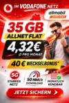 Die allmobil Allnet Flat Basic 5G liefert 35 GB für 5,99 €/Monat. Mit dem 40 € Wechselbonus bei Rufnummernmitnahme sinkt der Effektivpreis auf nur 4,32 € pro Monat. Anschlussgebühr wird automatisch erstattet!