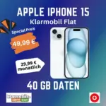 Hol dir das Apple iPhone 15 128GB für einmalig 49,99 € in Verbindung mit der Klarmobil Allnet Flat im Vodafone-Netz. Mit 40 GB Datenvolumen und einer Grundgebühr von nur 29,99 € pro Monat ist dieses Angebot perfekt, um immer und überall online zu sein.
