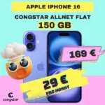 Das Apple iPhone 16 128GB gibt es aktuell für 169 € Zuzahlung zusammen mit dem Congstar Allnet Flat L Tarif. Bei einem Marktpreis von etwa 720 € schauen wir uns an, ob sich dieser Deal rechnet.