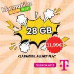 Suchst du einen günstigen Mobilfunktarif mit viel Datenvolumen und hoher Geschwindigkeit? Dann solltest du dir die EM-Aktion von Klarmobil nicht entgehen lassen. Hier bekommst du 28 GB 5G Internet im Telekom D1-Netz für nur 11,99 € im Monat.