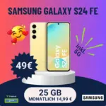 Das Samsung Galaxy S24 FE bekommst du jetzt mit einem starken Handyvertrag-Deal: 25 GB Datenvolumen für nur 14,99 Euro Grundgebühr und dabei sparst du richtig Geld.
