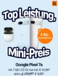 Für das Google Pixel 7a 128GB zahlst du einmalig nur 4,95 EUR. Der otelo Allnet Flat Go 7 GB Tarif kostet 14,99 EUR im Monat und bietet dir eine Allnet-Flat sowie 7 GB Datenvolumen im Vodafone-Netz. Zusätzlich erhältst du bei Rufnummernmitnahme einen Wechselbonus von 50 EUR.