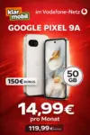 Das Google Pixel 9a gibt es bei klarmobil jetzt mit 50 GB 5G im Vodafone-Netz zu einem attraktiven Preis. Du zahlst durchschnittlich 19,99 € pro Monat – der Effektivpreis für den Tarif liegt bei nur 4,99 €. Ein solider Deal für Googles KI-Smartphone!