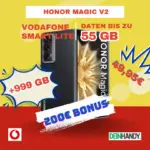 DEINHANDY packt beim Honor Magic V2 ein besonders attraktives Paket: Das Premium-Falthandy gibt’s mit einem starken Vodafone-Tarif zum absoluten Sparpreis. Je nach Option erhältst Du bis zu 55 GB Datenvolumen, zahlst effektiv bis zu 12,10 Euro weniger im Monat und sparst im Vergleich zum Einzelkauf bis zu 290 Euro.