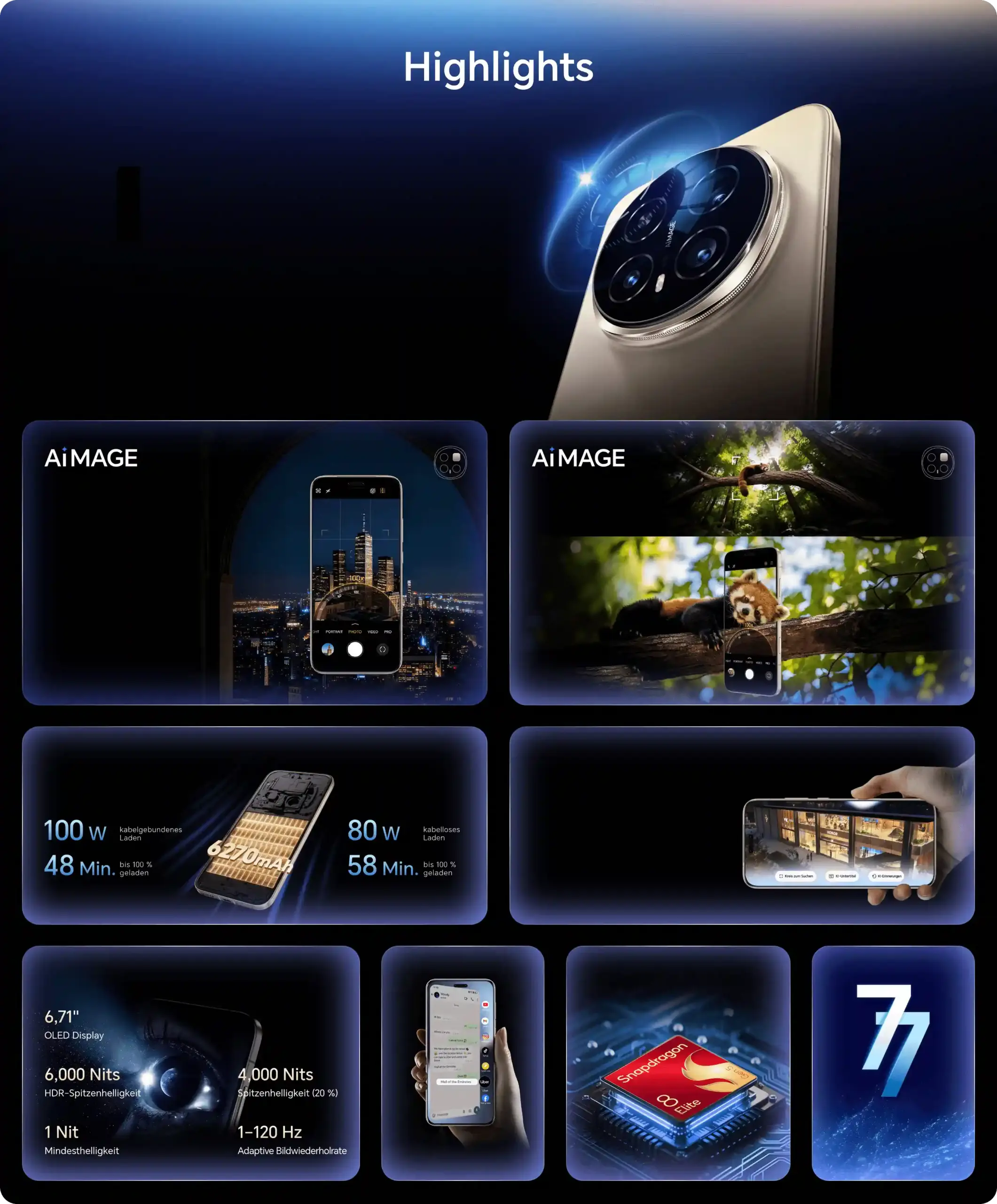 Die globale Version bietet 7.200 mAh, die EU-Version 6.270 mAh. Mit 100W Kabelladung in unter 40 Minuten voll. Kabelloses Laden und Reverse Charging inklusive.