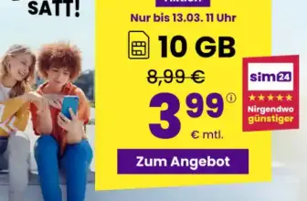 10 GB9,99 €sim24: 3,99 € (10 GB)6,00 €/Mon. (−60%)