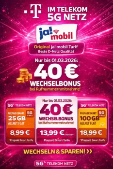 Die Prepaid-Tarife „Prepaid Smart“ von Penny Mobil und ja!mobil sowie „Smart S“ von Norma Connect beinhalten jetzt 10 GB statt der bisherigen 6 GB Highspeed-Datenvolumen im 5G Netz der Telekom. Der Preis bleibt unverändert bei 8,99 Euro für vier Wochen, inklusive Allnet-Flat für Anrufe und SMS.
