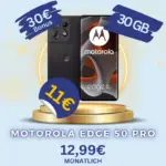 Das Motorola Edge 50 Pro ist aktuell mit einem richtig starken Tarif-Deal bei MediaMarkt erhältlich. Du bekommst das Smartphone mit einem großzügigen Datenvolumen von 30 GB zum besonders günstigen monatlichen Preis von nur 12,99 €. Dazu gibt’s eine einmalige Zuzahlung von lediglich 11 € statt der vorherigen 29 €. Ein super Angebot für ein Mittelklasse-Smartphone, das mit seiner Ausstattung durchaus beeindrucken kann.