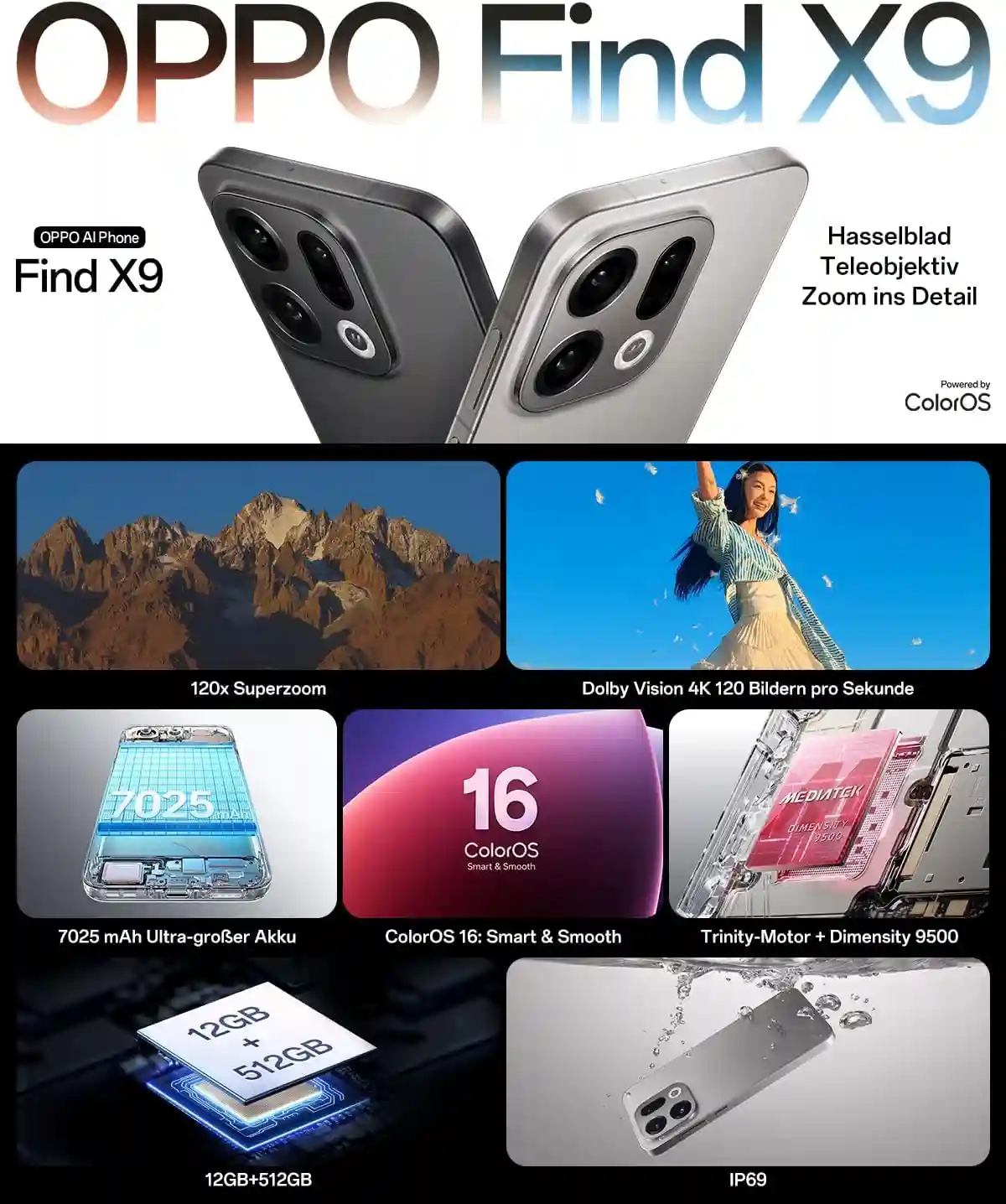 OPPO Find X9 mit Vertrag ab 1€ | Hasselblad & 7025 mAh