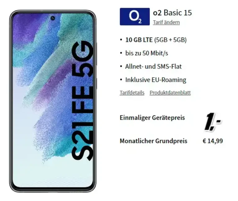 Sichere dir bei MediaMarkt das Samsung Galaxy S21 FE 5G für nur 1€ in Kombination mit dem o2 Basic Vertrag, der dir monatlich 10 GB für nur 14,99€ bietet. Galaxy S21 FE 5G für 1€ mit 10 GB o2 Basic Vertrag eff. gratis Effektivpreis Wenn du den Gesamtgerätewert von 419 € (Durchschnitt der ersten 15 Angebote auf idealo.de) berücksichtigst, ergibt sich eine effektive monatliche Grundgebühr...