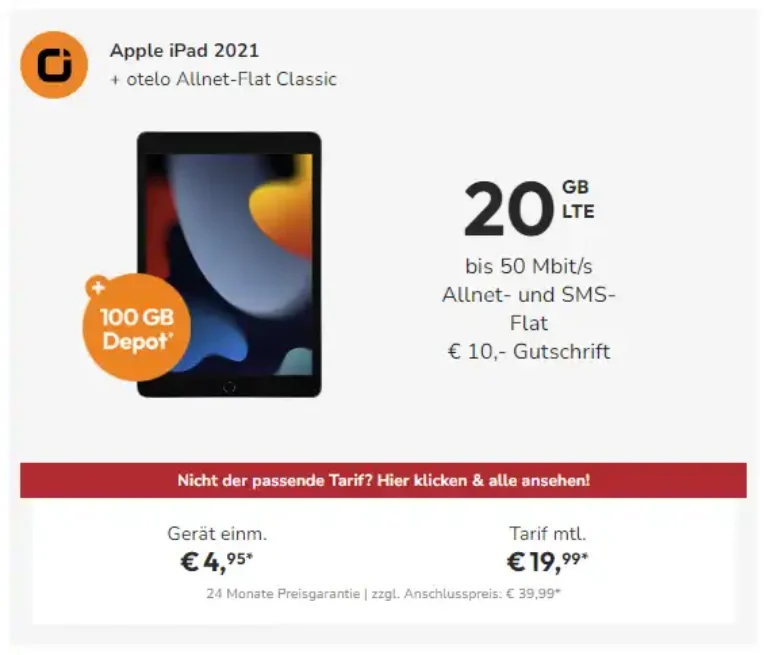 Sichere dir jetzt das kraftvolle Apple iPad 2021 (64 GB, WiFi) für nur 4,95 EUR bei Deinhandy, gekoppelt mit dem otelo Allnet Flat Classic Tarif. Genieße 20 GB Datenvolumen für nur 19,99 EUR im Monat. 🔥 Apple iPad 2021 für 4,95€ mit 20 GB Vodafone Vertrag + 100 GB Depot eff. 7,70€ / Monat Effektivpreis Wenn du den Wert des Smartphones (340€ | Durchschnitt der...