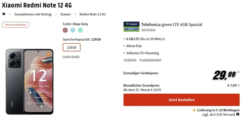 Bei MediaMarkt wartet ein echtes Highlight auf Dich: Ergattere das Xiaomi Redmi Note 12 für nur 29,99 EUR. Kombiniere es mit dem freenet green Telefonica LTE Tarif mit 6 GB Datenvolumen – und das für schlanke 7,99 EUR im Monat. Ein perfektes Paket für alle, die ein leistungsstarkes Smartphone und einen günstigen Tarif unter 10 EUR monatlich suchen! Xiaomi Redmi Note 12 für 29,99€ mit...