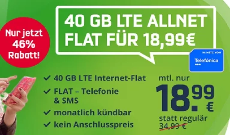 weiterlesen »Letzte Chance: 40 GB Telefonica (o2) Allnet Flat für 18,99€ | ohne Laufzeit