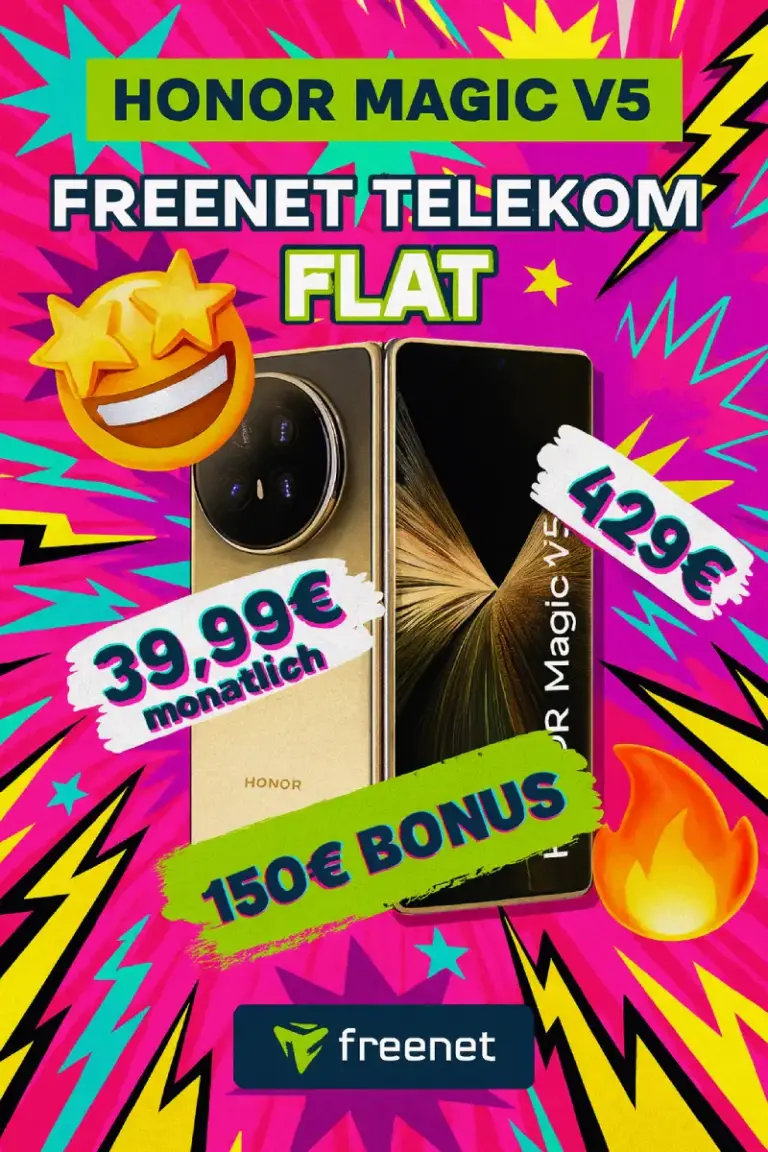Honor Magic V5 Foldable bei freenet: Mega-Deal! 512GB Foldable + 50 GB 5G – Effektivpreis nur -6,47€/Monat! Das gibt's selten: Das Honor Magic V5 – eines der dünnsten Foldables der Welt mit 512 GB – bekommst du bei Gomibo im Telekom-Netz mit negativem Effektivpreis von -6,47€/Monat! Das bedeutet: Der Tarif ist rechnerisch gratis und du sparst beim Gerät! Der Deal: 429€ einmalig + 39,99€/Monat für...