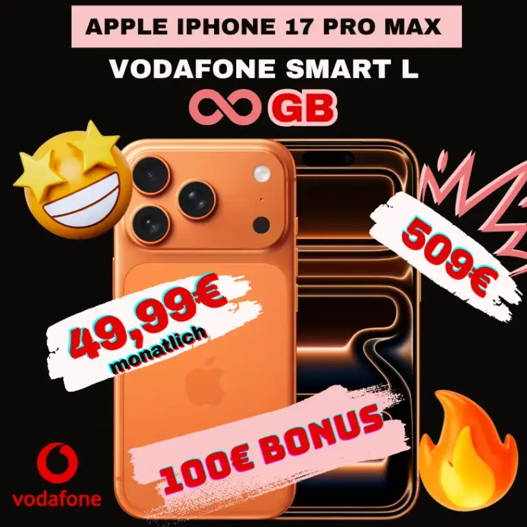 🔥 BLACK WEEK AKTION: Unlimited Datenvolumen statt Standard-Tarif! Nur für kurze Zeit verfügbar. iPhone 17 Pro Max mit Vodafone Smart L & 50€ Guthaben Das brandneue iPhone 17 Pro Max im Bundle mit Vodafones Unlimited-Tarif zur Black Week – und zusätzlich 50 € Vodafone-Guthaben geschenkt! Mit dem A19 Pro Chip, neuem Kamera-Design und unbegrenztem 5G-Datenvolumen holst du dir Apples aktuelles Flaggschiff zum Top-Preis. ⚡ Deal...