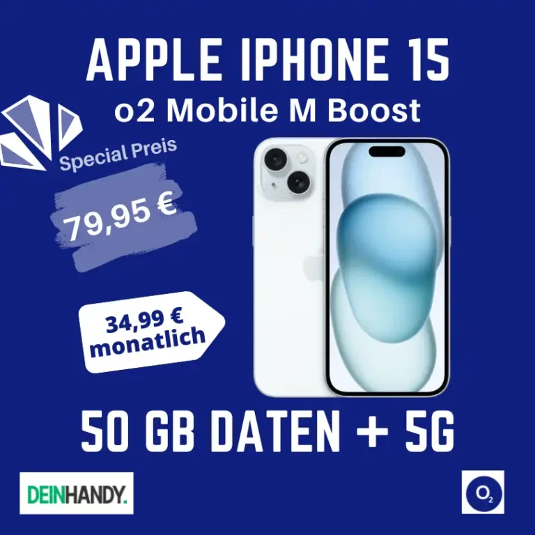 Auch wenn das iPhone 16 bereits auf dem Markt ist, überzeugt der Vorgänger, das iPhone 15, nach wie vor mit Top-Leistung und einem attraktiven Preis-Leistungs-Verhältnis. Wenn du ein leistungsstarkes Smartphone zu einem fairen Preis suchst, solltest du dir dieses Angebot genauer ansehen. Mit dem o2 Mobile M Boost Tarif erhältst du 50 GB Datenvolumen und zahlst einmalig 79,95 EUR für das iPhone 15. Die monatliche...