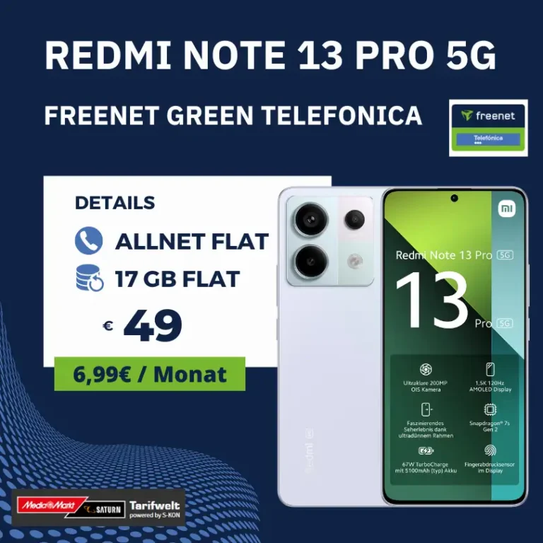 Du bist auf der Suche nach einem Smartphone mit einem starken Tarif, der perfekt zu deinem Alltag passt? Hier ist ein weiteres Highlight von MediaMarkt / Saturn: Das Xiaomi Redmi Note 13 Pro 5G (256 GB) für nur 49 € Zuzahlung in Kombination mit dem freenet green Telefonica 17 GB Tarif für 6,99 € im Monat. Die Highlights des Angebots Mit diesem Deal sicherst du...