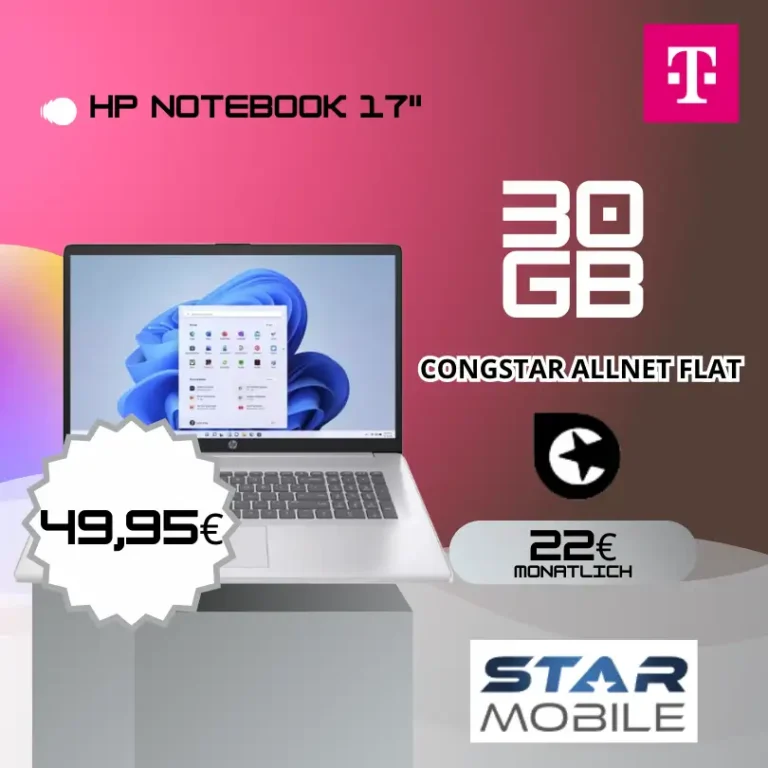 Du möchtest ein starkes Notebook und dazu einen attraktiven Tarif? Dann haben wir genau das richtige Angebot von Starmobile für dich! Sichere dir jetzt den HP Laptop 17,3" FHD Display (Intel Core i3-N305, 512 GB + 8 GB) für eine geringe Zuzahlung von 49,95 € und kombiniere ihn mit der congstar Allnet Flat M für nur 22 € im Monat. Tarifdetails auf einen Blick Tarif:...