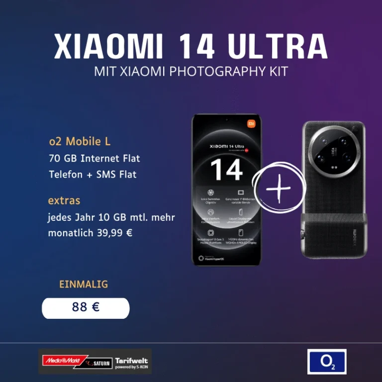 Mit dem Xiaomi 14 Ultra und dem Photography Kit für einmalig nur 88 EUR, angeboten von Saturn, kombiniert mit dem o2 Mobile L Tarif mit 70 GB Datenvolumen, erhältst du ein unschlagbares Angebot. Hier erfährst du alles, was du darüber wissen musst, inklusive der effektiven Kosten und der Tarifdetails. Das Angebot im Überblick Du kannst das Xiaomi 14 Ultra zusammen mit dem Photography Kit für...