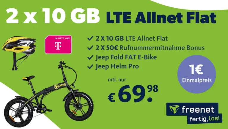 Willst du ein hochwertiges E-Bike zu einem Knallerpreis und obendrein noch zwei Telekom-Verträge mit je 10 GB Datenvolumen? Dann ist das Jeep E-Bike Bundle von Freenet genau das Richtige für dich! Hier bekommst du ein leistungsstarkes Jeep Fold Fat E-Bike FR 7020 inklusive Helm für nur 1 Euro Einmalpreis. Dazu gibt es zwei green LTE 10 GB Allnet-Flat Tarife im Telekom-Netz. Das Jeep E-Bike im...