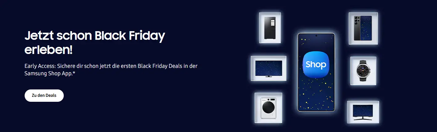 Samsung startet seine Black-Friday-Aktion bereits im Early Access ab dem 11. November 2025. Die Besonderheit: Du bekommst beim Kauf ausgewählter Galaxy-Geräte mit Handyvertrag hochwertige Haushaltsgeräte wie einen Side-by-Side-Kühlschrank oder einen Waschtrockner gratis dazu. Die Deals sind exklusiv über die Samsung Shop App buchbar.