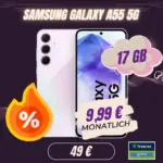 MediaMarkt bietet das neue Samsung Galaxy A55 mit einer 17 GB Allnet-Flat im Telefónica-Netz für nur 9,99 € monatlich an. Ein echter Preisknaller, denn: Der Tarif kostet effektiv nur rund 1 € pro Monat – ein absoluter Bestpreis für eine 5G Allnet-Flat dieser Größe.