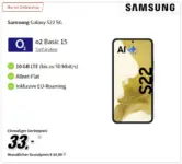 Hole dir bei MediaMarkt jetzt das Samsung Galaxy S22 128GB in Kombination mit dem günstigen o2 Basic 10 GB Tarif zum absoluten Sparpreis. Für einmalig nur 33€ kannst du das leistungsstarke Smartphone dein Eigen nennen und surfst mit satten 10 GB Datenvolumen durchs o2-Netz.