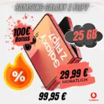 Das Samsung Galaxy Z Flip 7 mit Vodafone Smart Entry bietet einen negativen Effektivpreis von -18,30 Euro. Du bekommst nicht nur einen soliden 25 GB Tarif, sondern sparst auch 439 Euro beim Smartphone-Kauf.