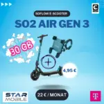 Du suchst nach einem zuverlässigen E-Scooter, der dir Freiheit und Flexibilität bietet? Bei starmobile gibt es aktuell ein unschlagbares Angebot: den SoFlow SO2 Air Gen 3 für nur 4,95€ in Kombination mit einem attraktiven congstar Allnet Flat Vertrag. Dieses Angebot bietet dir nicht nur einen hochwertigen E-Scooter, sondern auch einen Mobilfunktarif mit 30 GB LTE für 22€ pro Monat. Profitiere von diesem Deal und sei sofort startklar!