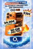 iPhone 17 Pro + o2 Unlimited – Deal-Übersicht Grundgebühr 34,99 € Zuzahlung 539 € Datenvolumen ...