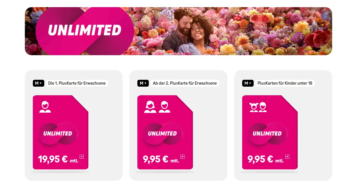 Ab MagentaMobil M (49,95 €) erhältst du mit mindestens einer PlusKarte unbegrenztes Datenvolumen für alle Karten – Hauptkarte und PlusKarten. MagentaEINS-Kunden (mit Telekom-Festnetz) erhalten Unlimited bereits ab MagentaMobil S.