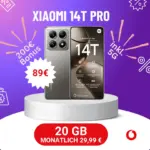 Hol dir das Xiaomi 14T Pro (512 GB) für eine einmalige Zuzahlung von 89 € zusammen mit dem Vodafone Smart Entry Tarif. Du bekommst hier ein absolutes Top-Smartphone mit viel Speicherplatz und einem starken Akku sowie einen 5G-Tarif mit 20 GB Datenvolumen.