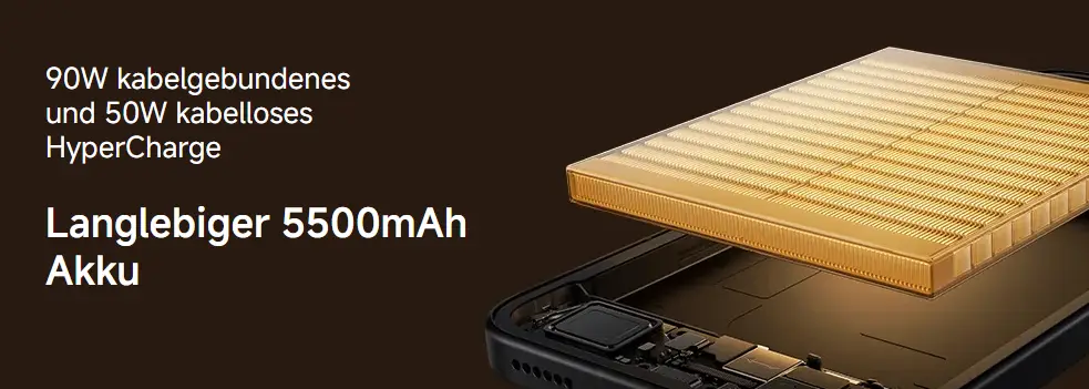 - Akku: 5.500 mAh, 90W Kabel + 50W Wireless